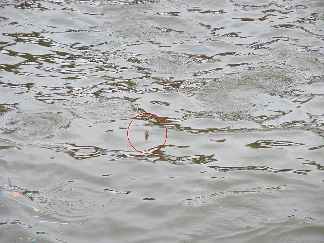 | Right in the middle you can see a fish poking his head out of the water |